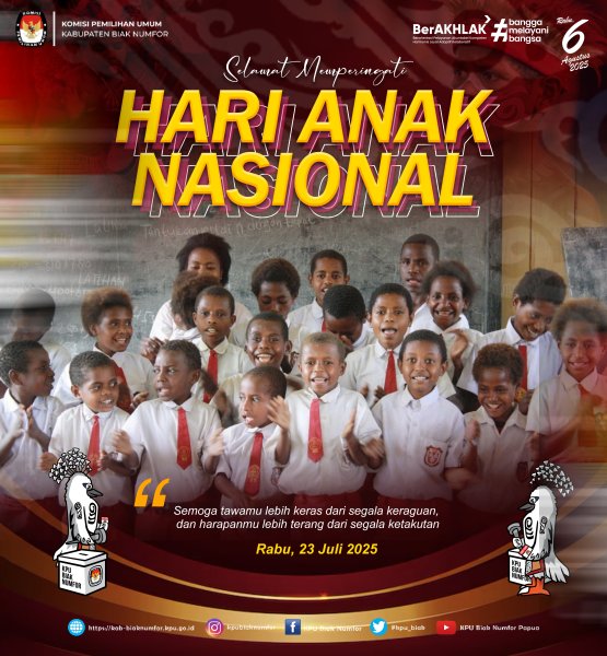 #TemanPemilih Selamat memperingati Hari Anak Nasional. Rabu, 23 Juli 2025 "Semoga tawamu lebih keras dari segala keraguan dan harapanmu lebih terang dari segala ketakutan " #KPUBiakNumfor #KPUMelayani #psugubcawagubpapua ....