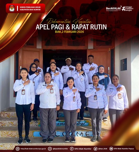 #TemanPemilih Biak, 2 Februari 2026. - KPU Kabupaten Biak Numfor melaksanakan Apel pagi dan Rapat Rutin pada minggu pertama bulan februari Apel pagi dipimpin oleh Kasubbag Perencanaan Data dan Informasi,Yuni Kristiani dalam arahan menyampaikan tetap semangat dan jaga kekompakan, tetap kita menjalankan Tugas pekerjaan kita yang berhubungan dengan Subbag masing-masing dan mari kita tingkatkan kualitas pekerjaan kita secara berkelanjutan. Apel pagi diakhiri dengan Doa bersama dan dilanjutkan dengan Rapat Rutin guna Evaluasi kegiatan sebelumnya, pemantauan kinerja, dan koordinasi perencanaan mendatang. #KPUBiakNumfor #KPUMelayani ....