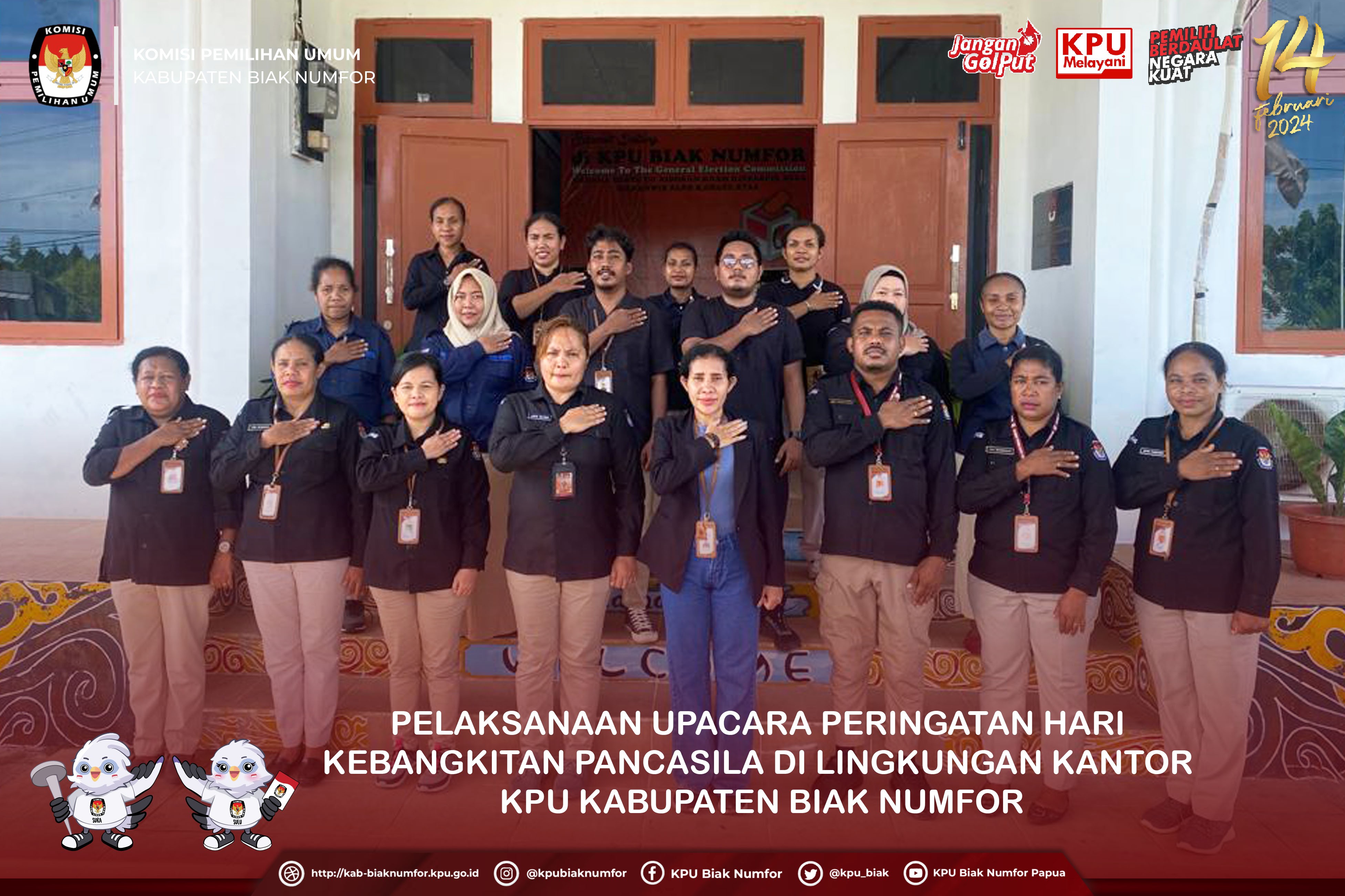 Turut hadir dalam pelaksanaan upacara Hari Kesaktian Pancasila Anggota KPU Biak Numfor, kassubag dan staf ASN, Tenaga PPNPN dan Tenaga Pendukung admin PPD. Upacara dipimpin Oleh Yemima M.Msiren Selaku Ketua Divisi Sosialisasi Pendidikan Pemilih dan Partisipasi Masyarakat dan SDM, dalam arahannya mangatakan bahwa dalam pelaksanaan Tahapan Pemilu perlunya menjaga kekompakan, tetap menjaga solidaritas dengan sesama penyelengara pemilu,para pemangku kepentingan dan seluruh elemen masyarakat agar pemilu Serentak 2024 mendatang menjadi sarana meningkatkan persatuan bangsa. Selain itu juga peringatan Hari Kesaktian Pancasila ini menjadi momentum untuk meningkatkan profesionalitas kerja demi pembangunan demokrasi di kabupaten Biak Numfor.
