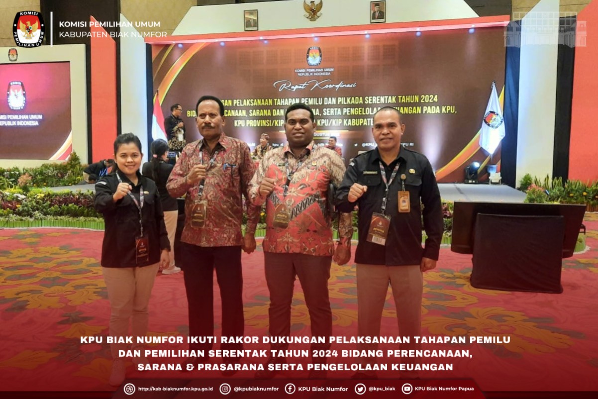 #TemanPemilih, Ketua KPU Kabupaten Biak Numfor Mathias Jan Morin, Ketua Divisi Perencanaan Data dan Informasi Matheus G. Ronsumbre dan Kasubbag Keuangan, Umum dan Logistik Yusuf F. Mamoribo serta Kasubbag Perencanaan Data dan Informasi Yuni Kristiani mengikuti Rapat Koordinasi Dukungan Pelaksanaan Tahapan Pemilu dan Pemilihan Serentak Tahun 2024 Bidang Perencanaan, Sarana dan Prasarana, Serta Pengelolaan Keuangan yang berlangsung di Nusa Dua Bali, Selasa (23/08/2022). Kegiatan ini diikuti lebih kurang 2.200 peserta KPU Provinsi/KIP Aceh dan KPU/KIP Kabupaten/Kota se-Indonesia. Ketua KPU Hasyim Asy’ari, Anggota KPU Yulianto Sudrajat, Betty Epsilon Idroos, Mochammad Afifuddin, August Mellaz, Parsadaan Harahap, Idham Holik, bersama Sekretaris Jenderal KPU Bernad Dermawan Sutrisno hadir dan membuka kegiatan ini berlangsung dari tanggal 23-25 Agustus 2022. Membuka rakor, Hasyim meminta satuan kerja KPU berkonsentrasi penuh dalam membahas khususnya perencanaan keuangan. Hasyim juga mengingatkan agar KPU Provinsi sebagai pemimpin kepemiluan dapat mengendalikan KPU Kab/Kota untuk bekerja cermat, tertib, disiplin dan berdasar aturan. Sementara itu, Yulianto menyampaikan terkait anggaran KPU Tahun 2022, rincian kegiatan tahapan KPU Tahun 2022, komposisi anggaran tahun 2022 untuk satuan kerja KPU, KPU Provinsi, KPU Kab/Kota, tata kelola keuangan Pemilu, hingga pengelolaan dan data aset Barang Milik Negara (BMN) KPU. Turut hadir, Inspektur Utama Nanang Priyatna, Fungsional Ahli Utama Penata Kelola Pemilu Tata Kelola Pemilu Purwoto Ruslan Hidayat, Kepala Biro Perencanaan dan Organisasi Suryadi, Kepala Biro Keuangan dan BMN Yayu Yuliani, pejabat eselon II Setjen KPU, Ketua, Anggota, Kepala Bagian, Kepala Subbagian yang menangani perencanaan, data dan informasi, serta keuangan, umum, dan logistik KPU Provinsi/KIP Aceh dan KPU/KIP Kab/Kota se-Indonesia. Adapun Dokumentasi Kegiatan :