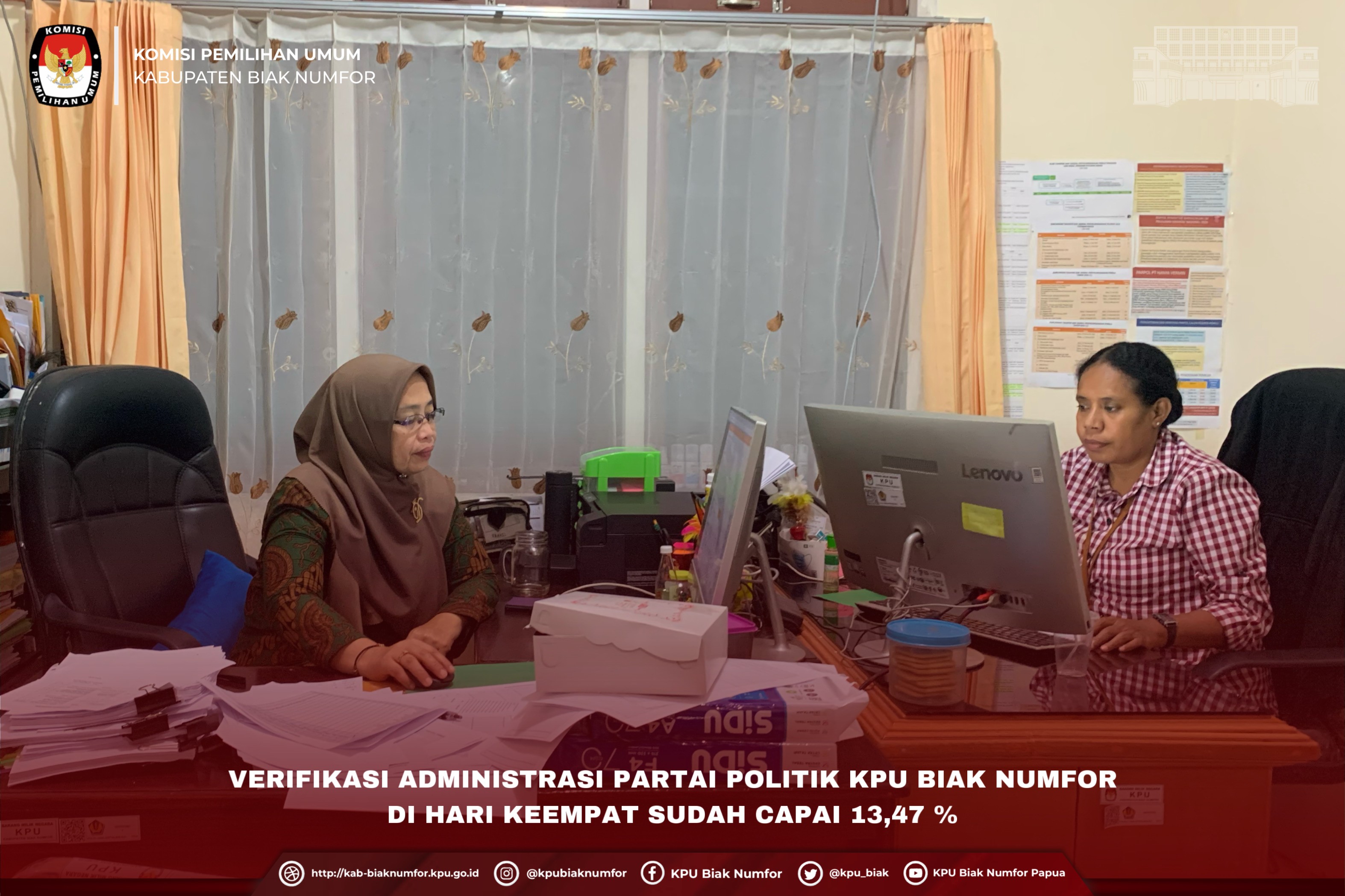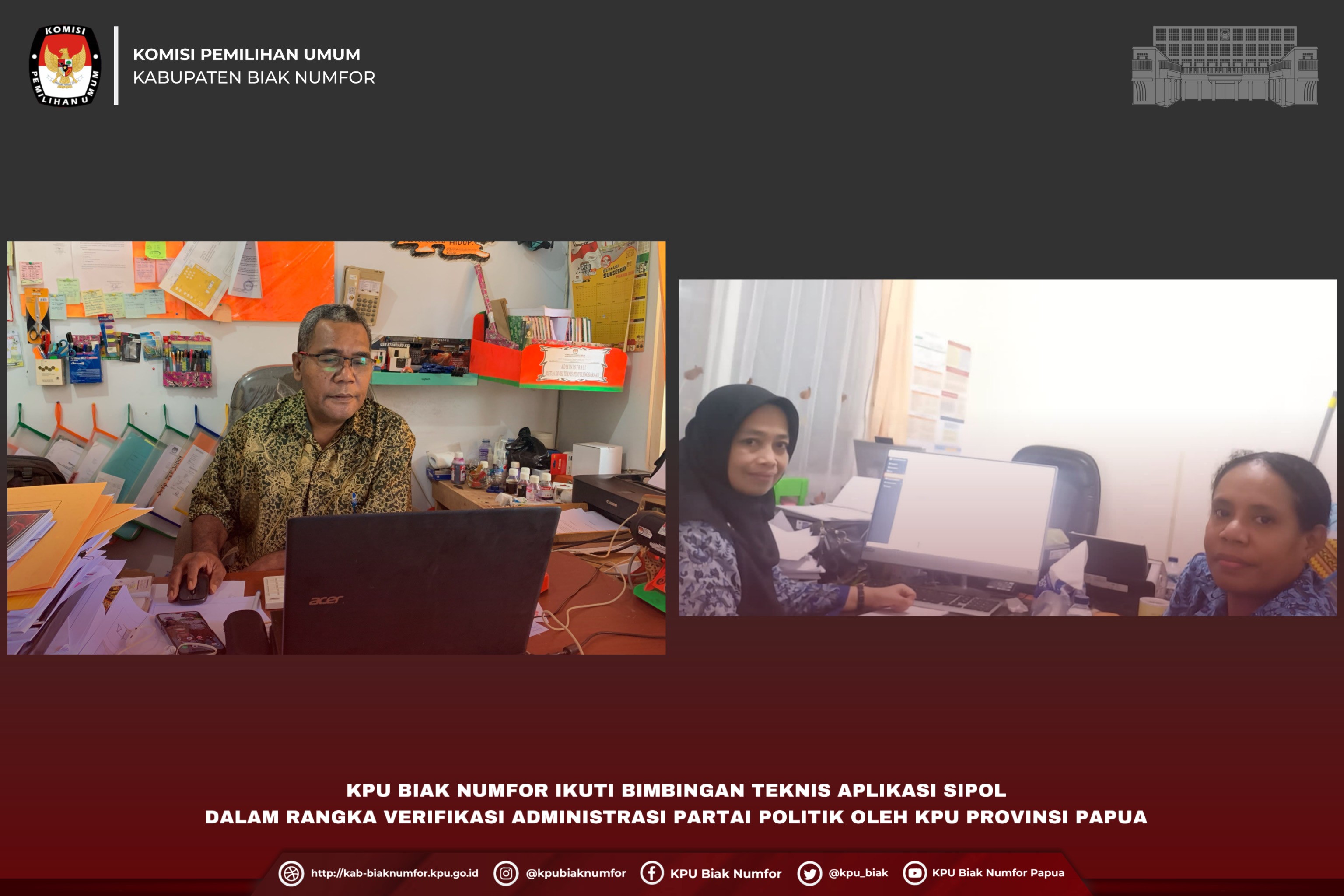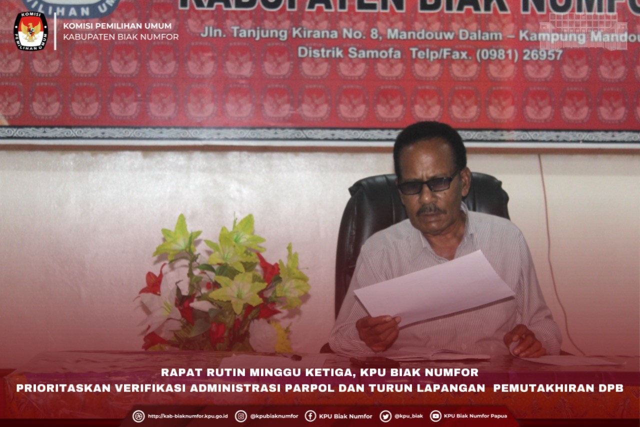 #TemanPemilih Dalam rangka memprogramkan kegiatan KPU Pada minggu ketiga bulan Agustus tahun 2022, maka pada Kamis (18/8/2022) KPU Kabupaten Biak Numfor menggelar Rapat Rutin yang dihadiri Ketua dan 3 Komisioner serta Sekretaris dan 2 Kepala Subbagian pada sekretariat KPU Kabupaten Biak Numfor. Ketua KPU Kabupaten Biak Numfor, Mathias Jan Morin menegaskan kegiatan Tahapan Verifikasi Administrasi Dokumen persyaratan Partai Politik tentunya menjadi perhatian untuk diprioritaskan dalam 2 minggu terakhir di bulan agustus mengingat sesuai jadwal dari 16 Agustus sampai dengan 29 Agustus 2022 ini merupakan Tahapan verifikasi administrasi secara Nasional sehingga diharapkan Tim Verifikator dokumen administrasi yang telah dibentuk dapat serius dalam melaksanakan tugasnya sehingga proses verifikasi administrasi dapat berjalan sesuai target waktu yang ditetapkan. Disamping itu Komisioner Divisi Perencanaan Data dan Informasi, Matheus G. Ronsumbre menegaskan disela-sela pelaksanaan Verifikasi administrasi proses Pemutakhiran Data Pemilih Berkelanjutan terus dilaksanakan sehingga personil yang tidak terlibat dalam verifikasi dokumen administrasi parpol dapat turun lapangan untuk melakukan cek data di lapangan terutama terkait data-data yang saat ini belum padan. Dari hasil rapat Rutin minggu ketiga ini telah diputuskan Tim Verikator berjumah 7 orang akan terus melakukan verifikasi pada setiap harinya dan yang tidak terlibat dalam tugas verifikasi akan turun lapangan untuk Pemutakhiran DPB dengan fokus pada Dapil Biak Kota, Samofa dan Biak utara serta pada bulan Agustus ini data Padan hasil sandingan data KPU dengan Ditjen Dukcapil akan ditindaklanjuti dalam aplikasi Sidalih. Disamping itu telah disepakati untuk Ketua dan Komisioner Rendatin serta Sekretaris dan Kasubag KUL serta Kasubag Rendatin akan mengikuti Rapat Koordinasi penyusunan Perencanaan di Bali. Adapun Dokumentasi Kegiatan :