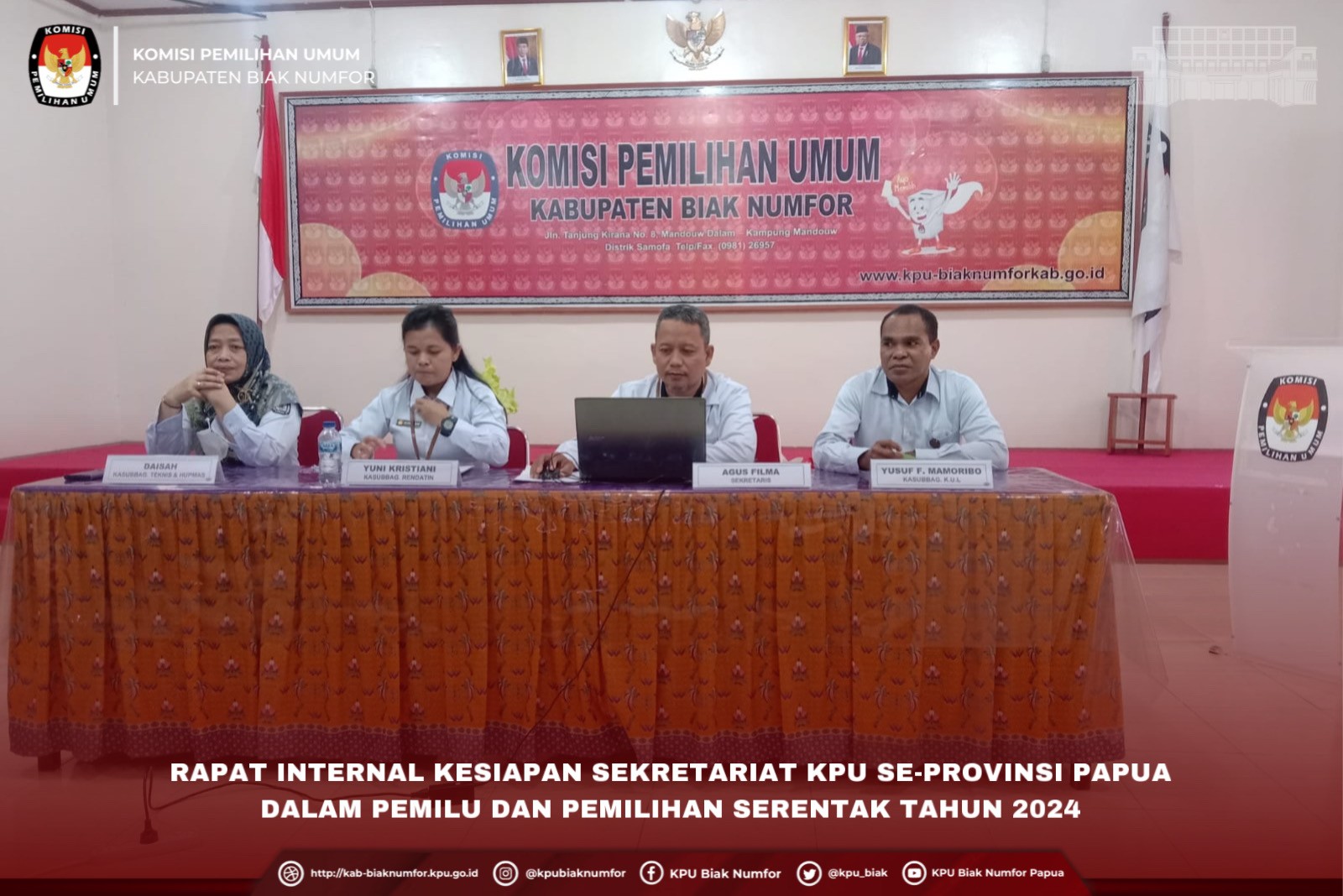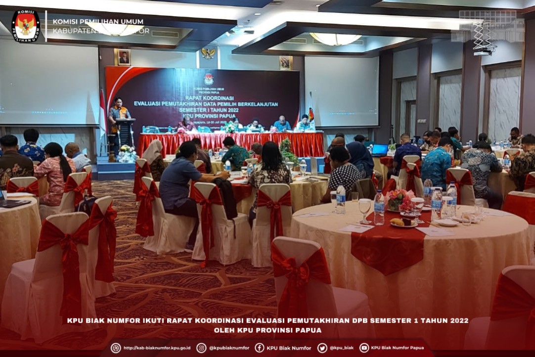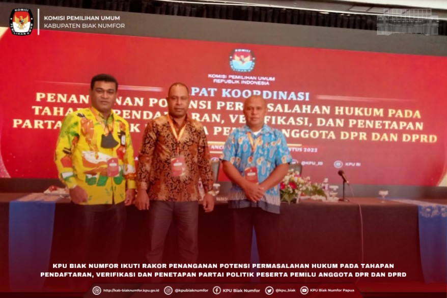 #TemanPemilih, Anggota KPU Kabupaten Biak Numfor Divisi Hukum dan Pengawasan, Melkianus Yusak Rumbrawer dan Kasubag Divisi Hukum dan Pengawasan , Petronella P. Toisuta mengikuti Rapat Koordinasi Penanganan Potensi Permasalahan Hukum pada Tahapan Pendaftaran, Verifikasi, dan Penetapan Partai Politik Peserta Pemilu Anggota DPR dan DPRD, di Jakarta yang diikuti 1.125 peserta terdiri Anggota Divisi Hukum, Kepala Bagian dan Kepala Sub Bagian menangani Hukum dan Pengawasan Internal KPU Provinsi/KIP Aceh dan KPU/KIP Kab/Kota se-Indonesia, Jumat (5/8/2022). Kegiatan dibuka oleh Ketua KPU Hasyim Asy’ari, Anggota KPU Mochammad Afifuddin, Parsadaan Harahap, Yulianto Sudrajat, August Mellaz, Betty Epsilon Idroos, bersama Sekretaris Jenderal KPU Bernad Dermawan Sutrisno. Dalam sambutannya, Hasyim menekankan pentingnya fokus dalam mengikuti kegiatan rakor ini, karena mulai awal hingga akhir tahapan terdapat potensi permasalahan hukum. Lebih lanjut, Hasyim meminta KPU Provinsi dan KPU Kab/kota menjalankan tugas dan wewenangnya dengan mencermati dan mempelajari kembali UU Nomor 7 Tahun 2017 tentang Pemilu, Peraturan KPU Nomor 4 Tahun 2022, dan pedoman teknis pendaftaran, verifikasi, dan penetapan partai politik peserta Pemilu 2024. Adapun Dokumentasi Kegiatan :