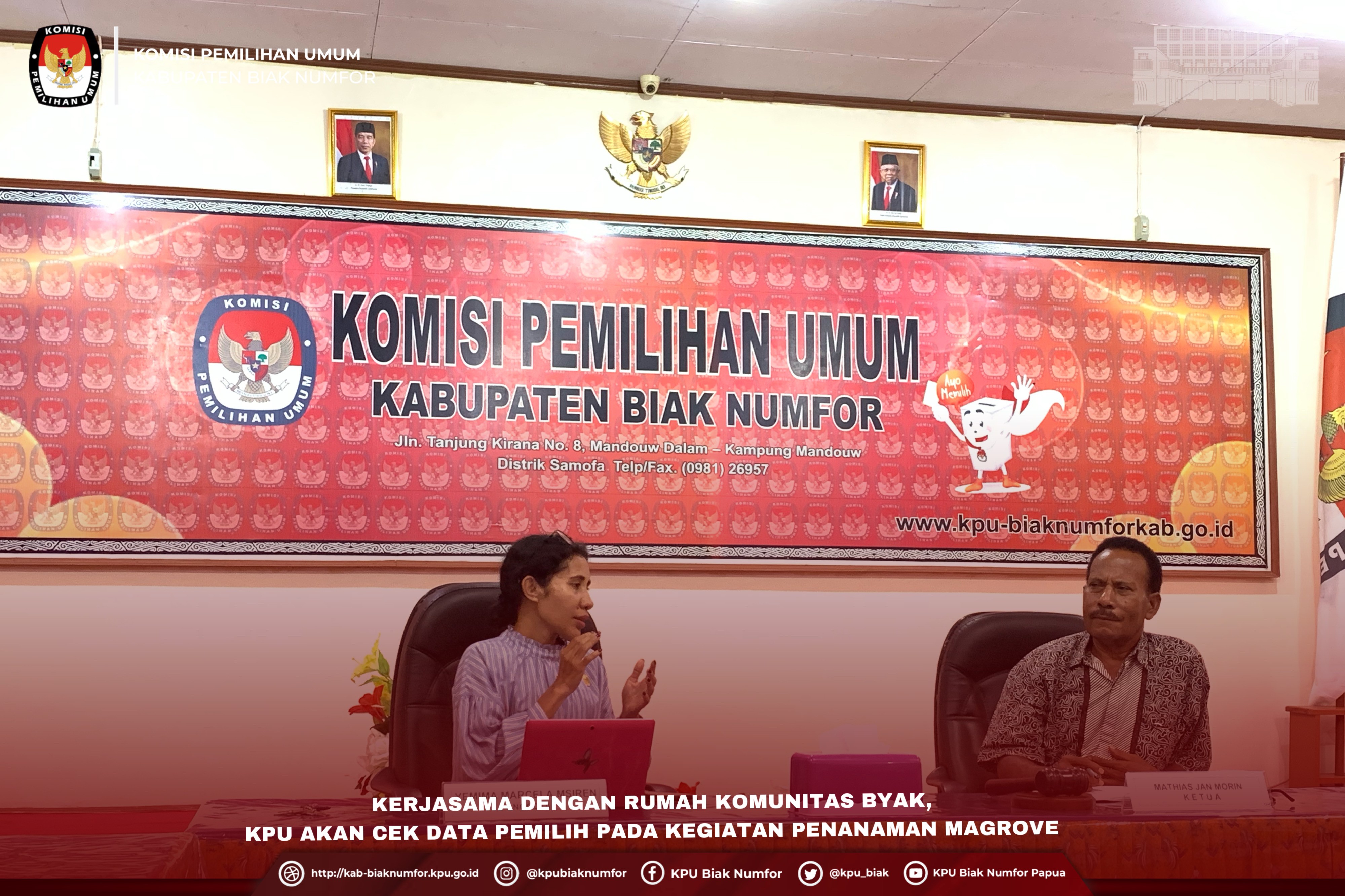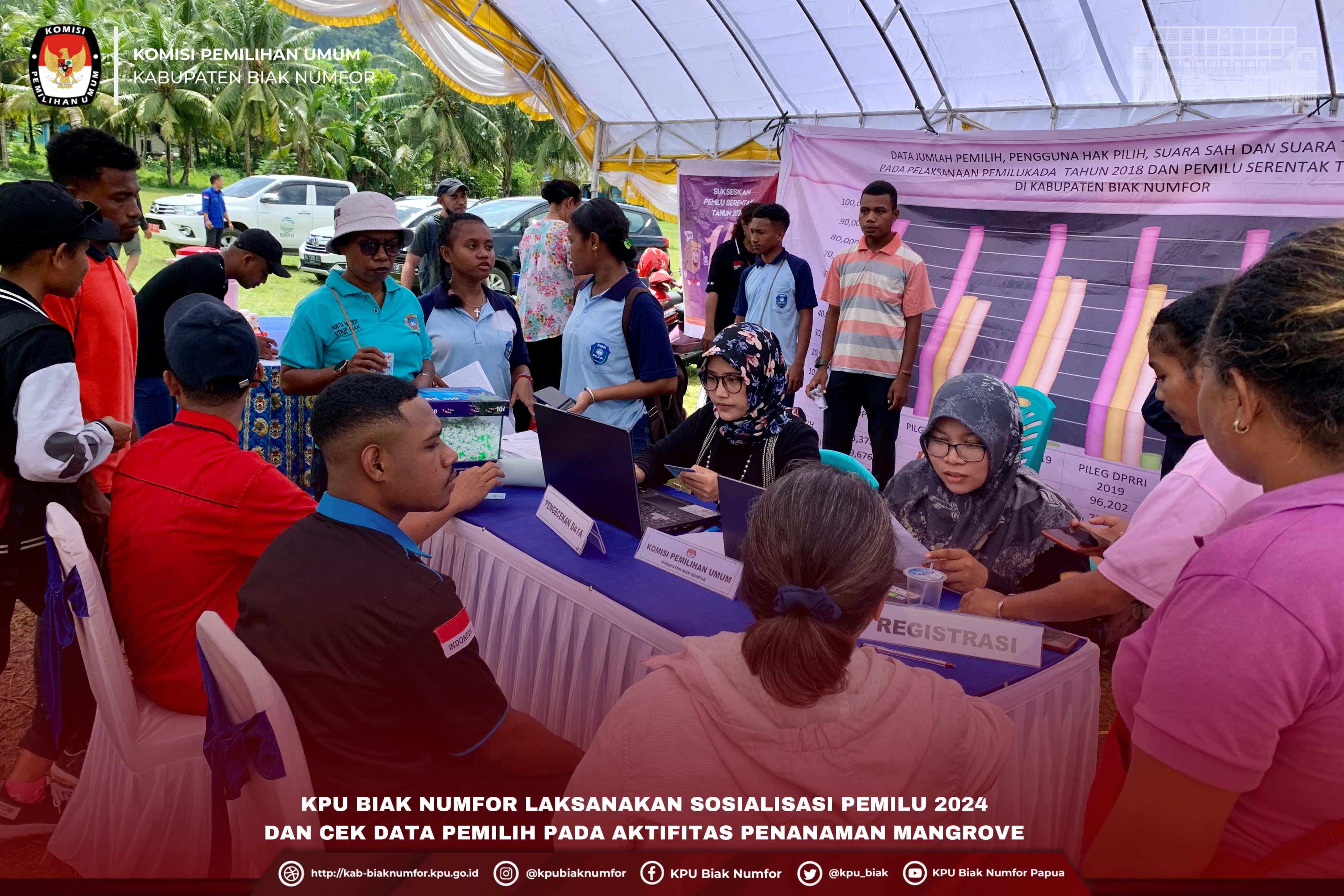 #TemanPemilih, Dalam rangka memperingati Hari Mangrove sedunia di Kabupaten Biak Numfor, maka Rumah Komunitas Byak melakukan Penanaman Mangrove sebanyak 2000 bibit dan KPU Kabupaten Biak Numfor berpartisipasi didalamnya dan melakukan upaya Sosialisasi Pemilu 2024 sekaligus melakukan Cek Data Pemilih yang dilaksanakan pada Sabtu (30/7/2022) bertempat di Pantai Sburya, Kampung Swapodibo yang diikuti pula oleh berbagai komunitas yang ada di Biak Numfor sebanyak kurang lebih 500 orang. Komisioner KPU KabupatenBiak Numfor Divisi Sosialisasi, Pendidikan Pemilih, partisimasi masyarakat dan SDM. Yemima Msiren dalam arahannya menyampaikan terima kasih kepada Rumah Kominitas Byak yang telah memberikan ruang kepada KPU Kabupaten Biak Numfor untuk berpartisipasi menanam mangrove sekaligus diberikan ruang untuk melakukan sosialisasi Pemilu 2024 dan melakukan Cek Data Pemilih. Lebih lanjut Yemima Msiren menegaskan pentingnya Data pemilih yang valid untuk menjamin kualitas Pemilu dan berharap seluruh warga masyarakat khususnya peserta Penanaman mangrove dapat berpartisipasi untuk melaporkan penduduk yang sudah meninggal dan penduduk yang sudah pindah sebagai Pemilih yang Tidak Memenuhi Syarat (TMS) serta penduduk yang datang ataupun penduduk yang sudah berumur 17 tahun untuk didaftarkan sebagai Pemilih dalam daftar pemilih di KPU Kabupaten Biak Numfor. Disamping itu Yemima Msiren juga menegaskan pentingnya seluruh Peserta penanaman Mangrove untuk menggunakan hak pilihnya pada Pemilu serentak 2024 yang akan dilaksanakan pada tanggal 14 Februari 2024 karena satu suara akan sangat menentukan kepemimpinan baik pada level negara maupun level daerah. Pada pelaksanaan kegiatan ini KPU Kabupaten Biak Numfor menurunkan Tim yang terdiri dari tenaga PNS di KPU Biak Numfor serta siswa Praktek Kerja Industri yang melakukan kegiatan di KPU Kabupaten Biak Numfor serta berpartisipasi dalam pemberian Doorprize untuk memotivasi para peserta penanaman mangrove dan KPU Kabupaten Biak Numfor telah melakukan cek data pemilih sebanyak 66 orang. Adapun Dokumentasi Kegiatan :