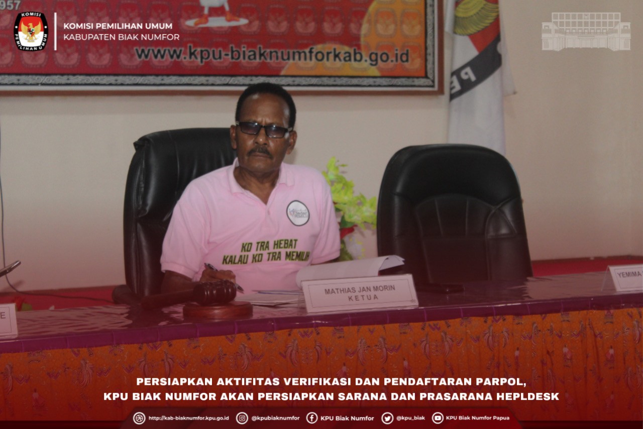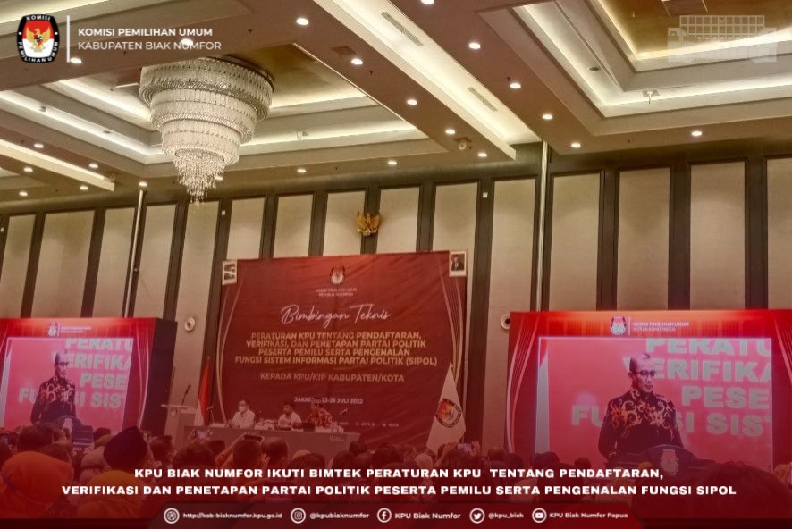 #TemanPemilih, Bertempat di Ball Room Hotel Haris Vertu Jakarta, Ketua Divisi Teknis Penyelenggaraan KPU Kabupaten Biak Numfor Djoni Randongkir, Ketua Divisi Perencanaan Data dan Informasi Matheus G. Ronsumbre, Kasubbag Teknis Penyelenggaraan Pemilu Partisipasi dan Hubungan Masyarakat Daisah beserta Staf/Operator Leni I. Rumabar mengikuti Pembukaan Bimbingan Teknis ( Bimtek) Peraturan KPU tentang Pendaftaran, Verifikasi dan Penetapan Partai Politik Peserta Pemilu serta Pengenalan Fungsi Sistem Informasi Partai Politik (SIPOL) kepada KPU Provinsi/KIP Aceh dan KPU/KIP Kabupaten/Kota se-Indonesia, yang dilaksanakan oleh KPU Republik Indonesia pada Sabtu (23/7/2022). Kegiatan Bimtek diikuti oleh 34 KPU Provinsi dan 514 KPU Kabupaten/Kota se-Indonesia dan dilaksanakan selama 3 hari dari tanggal 23 s.d 25 Juli 2022. Jumlah peserta yang hadir sebanyak 2.260 orang. Kegiatan terbagi dalam tiga lokasi dan saling terhubung melalui telekonferensi, yakni Hotel Grand Sahid Jakarta, Grand Mercure Harmoni dan Haris Vertu Jakarta. Dalam pembukaan, Ketua KPU RI Hasyim As'ari dari hotel Grand Sahid Jakarta meminta agar peserta bimtek KPU/KIP Kabupaten/Kota mencermati PKPU Nomor 4 Tahun 2022 khususnya ruang lingkup dan tanggung jawab mereka dalam proses verifikasi faktual terkait tiga hal yakni kepengurusan, kantor, dan anggota partai politik tingkat kabupaten/kota. Senada, Idham selaku Ketua Divisi Teknis Penyelenggaraan dari hotel Haris Vertu menekankan pentingnya bimtek sebagai sarana berbagi pengetahuan hukum memahami PKPU dan juga SIPOL. Untuk itu, keseriusan KPU/KIP Kabupaten/Kota adalah bentuk aktualisasi mewujudkan tahapan berintegritas. Usai dibuka, kegiatan bimtek berlanjut dengan diskusi panel dengan narasumber dari Bawaslu, DKPP dan Tim Pengembang SIPOL dari Institut Teknologi Bandung (ITB). Kegiatan Bimtek ini menjadi ilmu bagi KPU Kabupaten Biak Numfor dalam menyambut tahapan verifikasi partai politik. Adapun Dokumentasi Kegiatan :