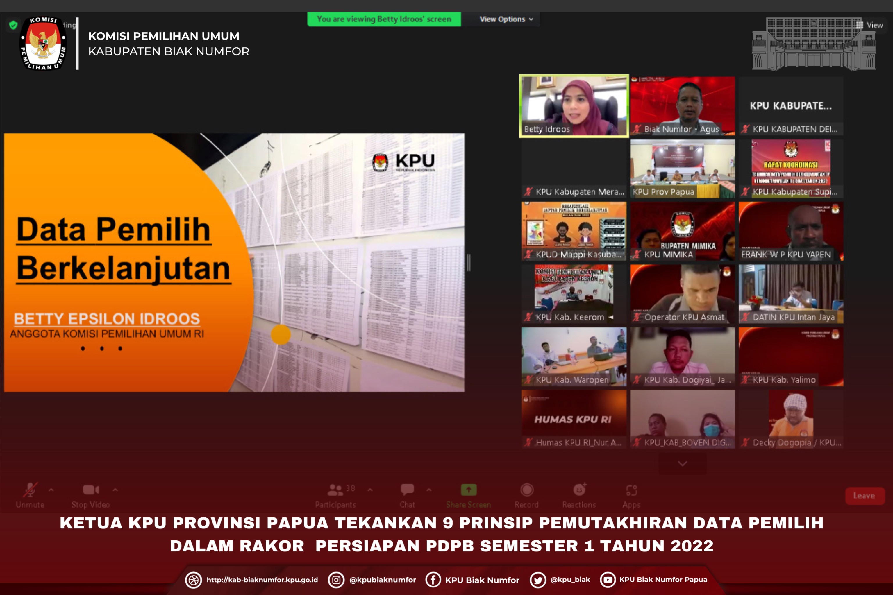 #TemanPemilih, Dalam rangka persiapan pemutakhiran Data Pemilih Berkelanjutan di tingkat Provinsi Papua, KPU Provinsi Papua menggelar Rapat Koordinasi yang dihadiri Ketua KPU dan Komisioner Divisi Hukum dan Pengawasan KPU Provinsi Papua serta dihadiri secara Daring oleh Komisoner Divisi Perencanaan Data dan Informasi dan admin Sidalih KPU Kabuapten Biak Numfor serta 28 Komisioner Perencanaan Data dan Informasi serta Kasubag dan admin Sidalih KPU Kabupaten/ Kota se Papua.