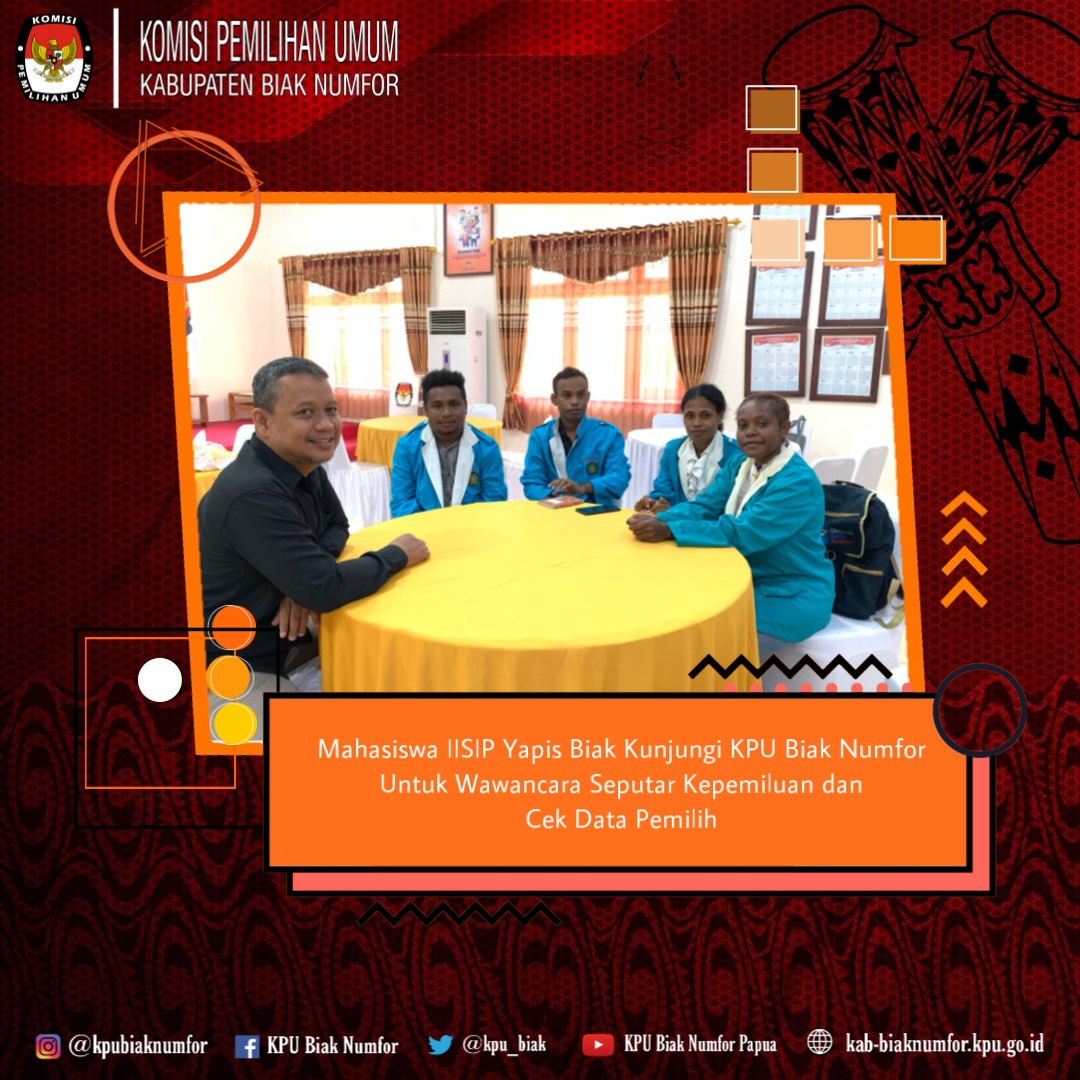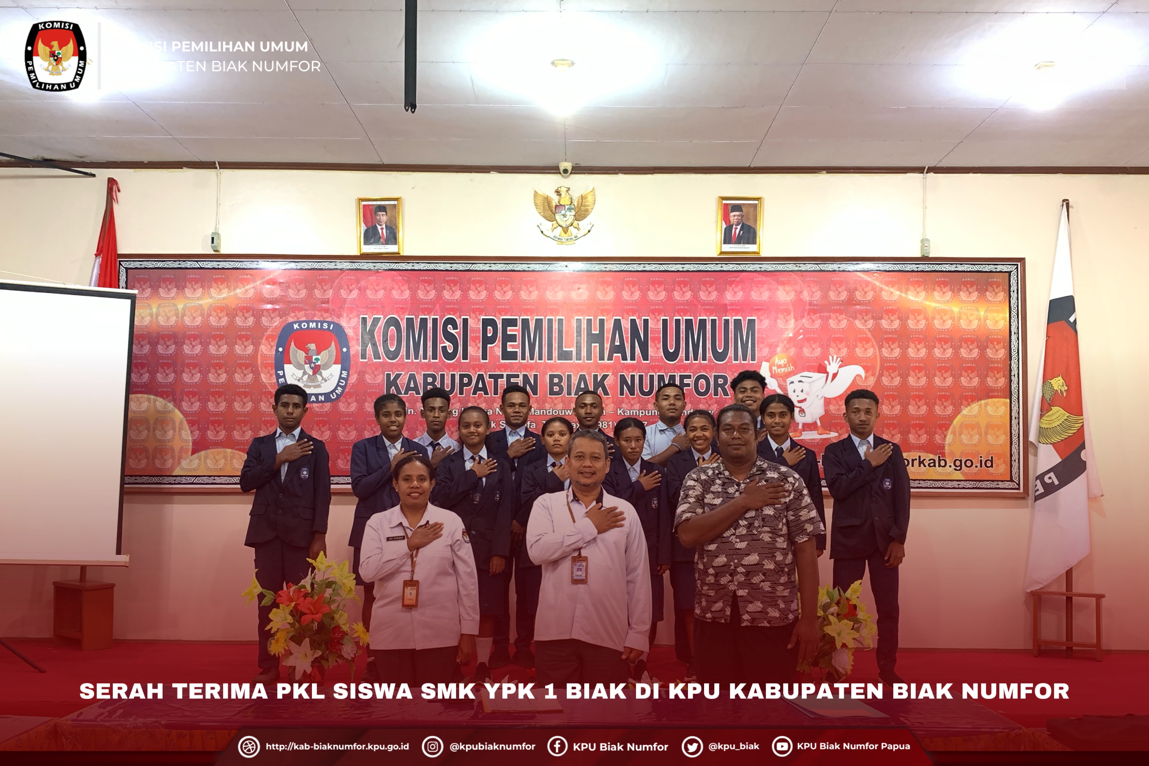 Dalam kesempatan ini Bastian Wospakrik selaku guru pendamping melakukan serah terima siswa PKL kepada pihak KPU Kabupaten Biak Numfor yang diterima langsung oleh Sekretaris KPU Kabupaten Biak Numfor, beliau menyampaikan dengan adanya praktek kerja lapangan ini diharapkan siswa dapat lebih siap dan mengetahui seperti apa gambaran dunia kerja setelah mereka lulus nanti, serta mengasah dan menambah ilmu pengetahuan.