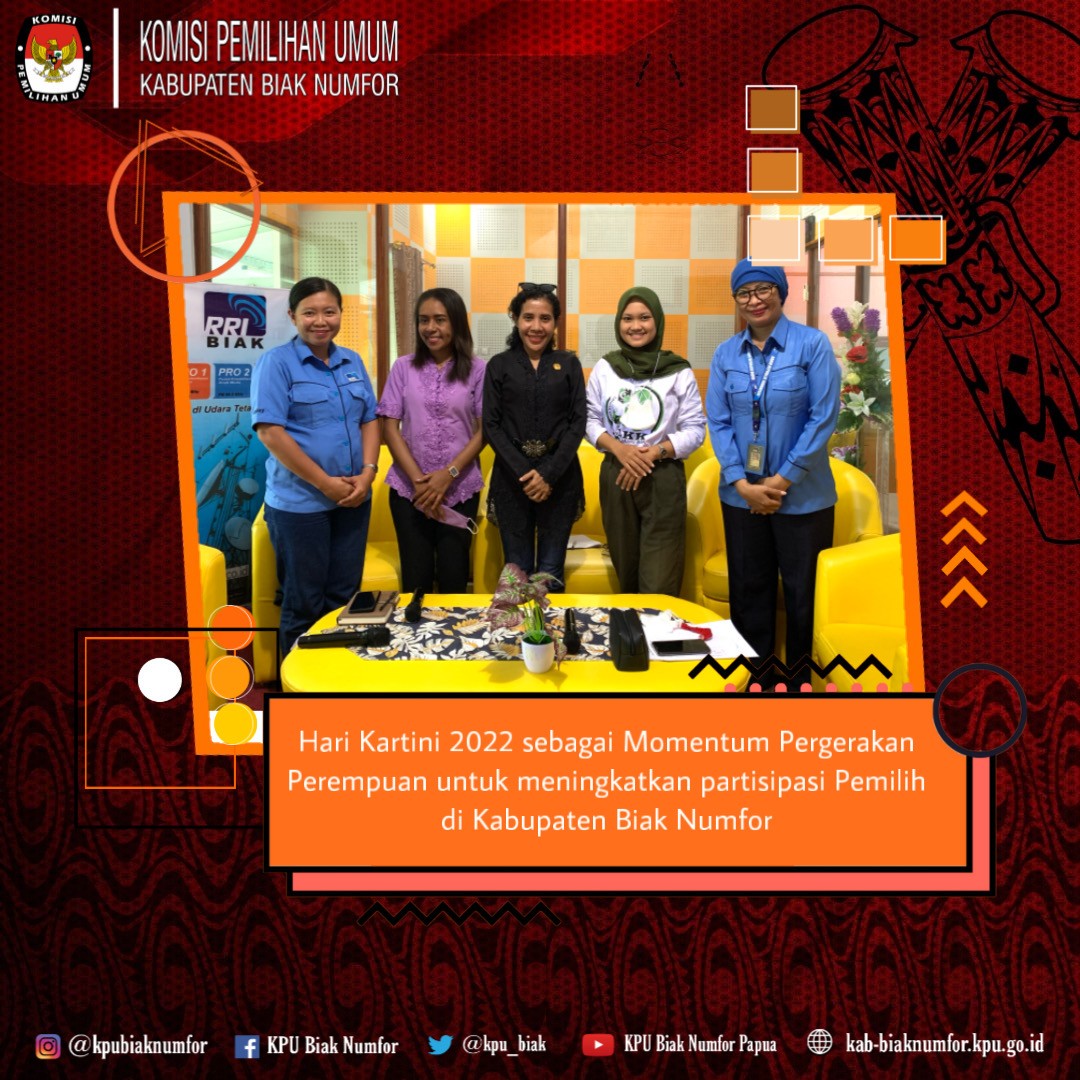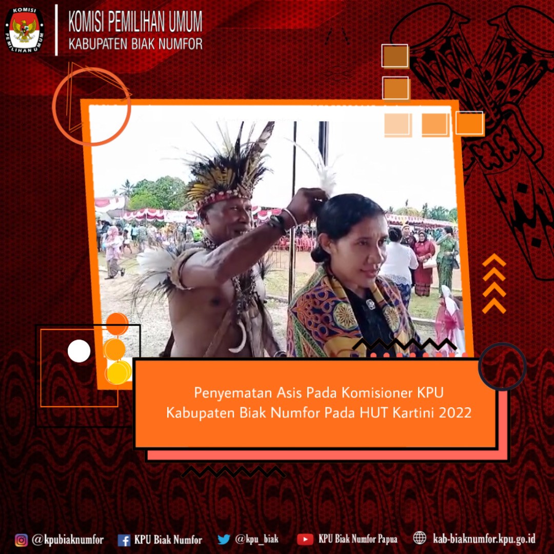 Komisioner KPU Biak Numfor Hadiri Peringatan Hari Kartini Dan Ikuti Pencanangan Kembali Pemakaian Asis Sebagai Identitas Budaya Perempuan Dalam rangka peringatan Hari kartini di Kabupaten Biak Numfor, KPU Kabupaten Biak Numfor turut menghadiri Upacara peringatan pada Kamis (21/4/2022) bertempat di lapangan cenderawsih Biak yang mengusung Tema Dengan Semangat RA Kartini kita Tingkatkan Kreatifitas Perempuan dan Anak guna Menopang Pembangunan Kepribadian Bangsa. Komisioner KPU Kabupaten Biak Numfor Divisi Sosialisasi Pendidikan Pemilih dan Partisipasi Masyarakat dan SDM, Yemima Msiren yang hadir mewakili Ketua KPU Kabupaten Biak Numfor memberikan apresiasi atas sambutan Ketua DWP Biak Numfor yang mengingatkan kembali dengan sosok RA Kartini sehingga menjadi inspirasi bagi seluruh Wanita Indonesia yang bila dikaitkan dengan peran wanita dalam bidang politik tentunya sangat punya pengaruh yang besar. Yemima Msiren juga memberikan apresiasi dan mendukung apa yang disampaikan Ketua Tim Penggerak PKK Biak Numfor yang mengajak Kaum Perempuan untuk dapat berekpresi serta berani tampil untuk memberikan talenta terbaiknya, memperikan pelayanan kepada masyarakat dan Motivasi untuk terus berkarya dan memberikan pengabdian terbaik bagi keluarga, mwngingat hasil Pemilu 2019 lalu di Biak Numfor telah menghasilkan bertambahnya keterwakilan perempuan di Legislatif bahkan dua perempuan telah memimpin DPRD Biak Numfor sebagai Ketua dan Wakil ketua DPRD Kabupaten Biak NUmfor untuk periode 2019-2024. Pada kesempatan menghadiri Perayaan Hari Kartini ini, Yemima Msiren juga berkesempatan mengikuti pencanangan “ASIS” sebagai salah satu identitas perempuan Biak dan berharap momentum ini dapat menjadikan pemakaian ASIS dapat digunakan dengan tepat sesuai aturan-aturan adat dan budaya Orang Biak. Adapun Dokumentasi Kegiatan :