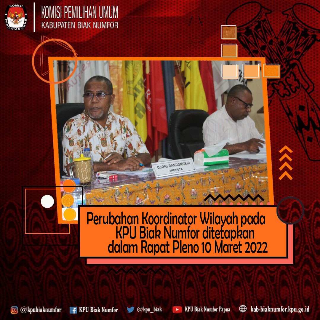 Sesuai PKPU nomor 8 tahun 2019 dan diperbaharui dalam PKPU nomor 3 tahun 2020 tentang Tata Kerja Komisi Pemilihan Umum, Komisi Pemilihan Umum Provinsi, Dan Komisi Pemilihan Umum Kabupaten/Kota, rapat pleno adalah forum tertinggi dalam pengambilan keputusan anggota KPU, KPU Provinsi, dan KPU Kabupaten/Kota. Oleh sebab itu untuk menindaklanjuti hasil Rapat Pleno Rutin pada awal minggu terkait pentingnya melakukan perubahan komposisi Koordinator Wilayah pada KPU Kabupaten Biak Numfor, maka pada kamis (10/3 2022) sesuai hasil Rapat Pleno yang dhadiri lengkap 5 Komisioner dan Sekretaris serta Kasubag Hukum dan SDM KPU Biak Numfor telah ditetapkan perubahan Koordinator dan Wakil Koordinator Wilayah pada KPU Kabupaten Biak Numfor. Ketua KPU Kabupaten Biak Numfor, Mathias Jan Morin dalam arahannya menyampaikan pentingnya pemantapan tugas dan peran Komisioner dalam pembagian wilayah pada KPU Kabupaten Biak Numfor sehingga perlu dilakukan perubahan disesuaikan dengan kondisi masing-masing komisioner. Dari hasil penetapan Koordinator Wilayah pada masing-masing Daerah Pemilihan serta wilayah Distrik telah ditetapkan pembagiannya antara lain Wilayah Dapil 1 yang meliputi Distrik Biak Kota dibawah koordinator Djoni Randongkir dengan wakil Koordinator Matheus G. Ronsumbre, Wilayah Dapil 2 yang meliputi Distrik Samofa dibawah coordinator Yemima Msiren dan wakil Koordinator Djoni Randongkir, Wilayah Dapil 3 yang meliputi Distrik Biak Timur, Oridek, Padaido dan Aimando Padaido dibawah koordinator Matheus G. Ronsumbre dan wakil coordinator Mathias J. Morin, Wilayah Dapil 3 yang meliputi Distrik Yendidori, Biak Barat, Swandiwe, Numfor Timur, Numfor Barat, Poiru, Orkeri dan Bruyadori dibawah koordinator Mathias J. Morin dan wakil coordinator Melkianus Rumbrawer dan wilayah Dapil 5 yang meliputi Distrik Biak Utara, Yawosi, Andey. Bondifuar dan Warsa dibawah koordinator Melkianus Rumbrawer dan wakil koordinator Yemima M. Msiren.