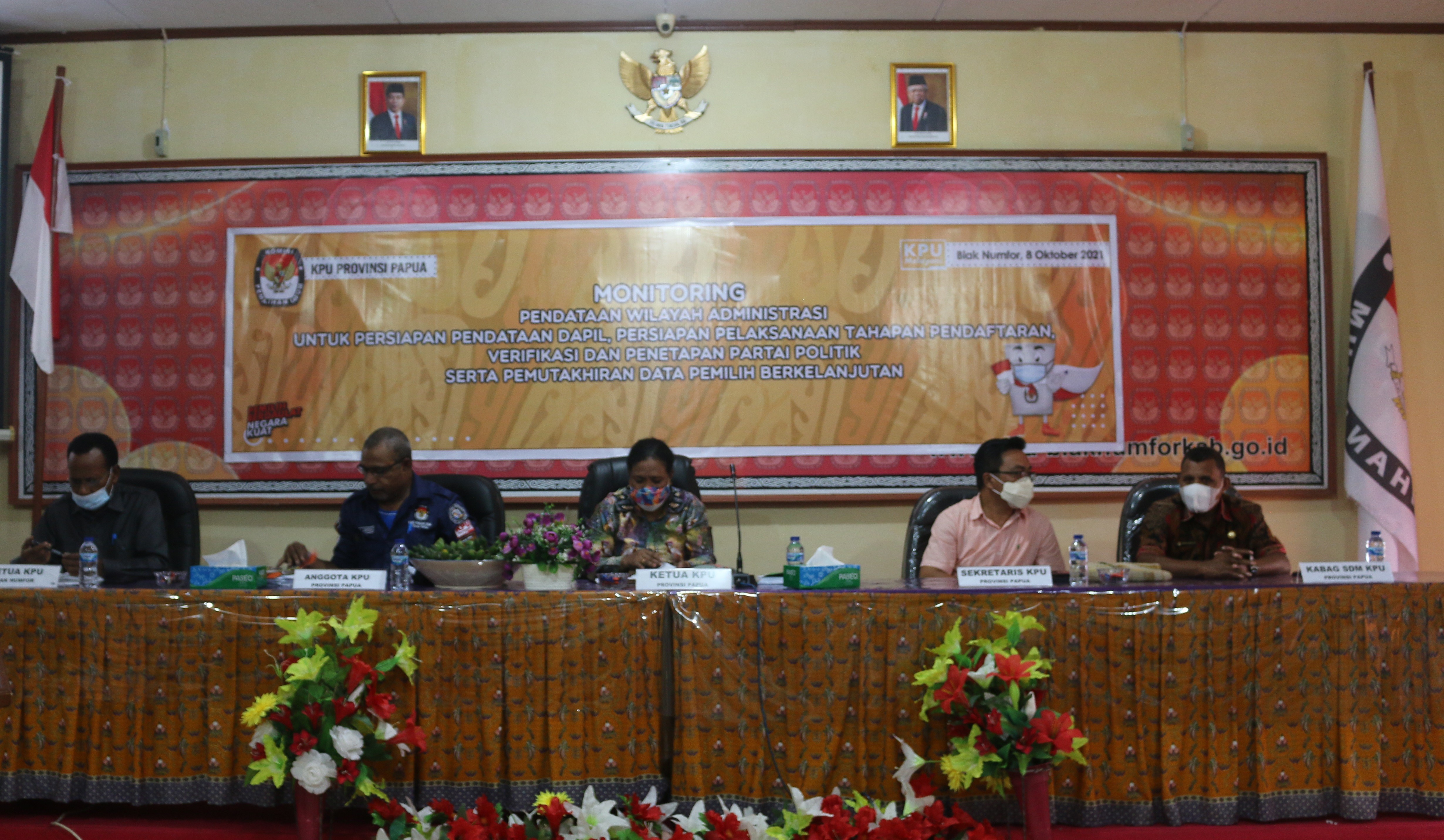 Dalam rangka melakukan persiapan Pemilu dan Pemilihan Serentak Tahun 2024, KPU Provinsi Papua melakukan kunjungan ke KPU Kabupaten Biak Numfor pada Jumat (8/10 2021) dalam rangka monitoring terkait pendataan Wilayah Administrasi untuk persiapam pendataan Dapil, persiapan pelaksanaan Tahapan Pendaftaran, verifikasi dan Penetapan Partap Politik serta Pemutakhiran Data Pemilih Berkelanjutan (DPB). Kunjungan ini dihadiri Ketua KPU Provinsi Papua dan Komisioner Divisi Sosialisasi Pendidikan Pemilih, Partisipasi Pemilih dan SDM serta Ketua dan anggota KPU Kabupaten Biak Numfor serta Asisten I dan Kabag Pemerintahan dan Kabag Hukum serta perwakilan partai Politik di Kabupaten Biak Numfor dan juga Ketua dan anggota Bawaslu kabupaten Biak Numfor. Ketua KPU Kabupaten Biak Numfor, Mathias Jan Morin dalam sambutan selamat datang menyampaikan terima kasih atas kunjungan KPU Provinsi papua dan memberikan pencerahan dan motivasi kepada KPU Biak Numfor dan partai Politik yang ada di Biak Numfor. Untuk itu KPU Biak Numfor siap mendukung seluruh program KPU dari tingkat atas walaupun dalam pelaksanaannya banyak keterbatasan baik dari sisi pendanaan maupun Sumber Daya Manusia. Ketua KPU Provinsi Papua, Diana Dorthea Simbiak yang membuka Kegiatan Monitoring KPU Provinsi Papua menjelaskan pentingnya KPU Provinsi turun ke seluruh Kabupaten dan Kota di Provinsi Papua untuk mengetahui kondisi kekinian terkait beberapa hal yang perlu dipersiapkan menjelang pelaksanaan Pemilu dan Pemilihan serentak 2024 yang tentunya akan menjadi bagian penyusunan rencana pelaksanaan kegiatan kedepannya. Salah satu hal yang menjadi fokus perhatian KPU Provinsi antara lain adalah perubahan wilayah administrasi yang tentunya sangat mempengaruhi pendataan untuk penentuan daerah Pemilihan di masing-masing Kabupaten/ Kota sehingga dengan kunjungan KPU Provinsi ini akan dilakukan komunikasi bersama pemangku kepentingan di Biak Numfor untuk melihat perubahan data administrasi di Biak Numfor sehingga sejak dini sudah dapat dipetakkan permasalahan dalam penentuan Daerah Pemilihan. Hal lain yang disampaikan Diana Simbiak yang menjadi perhatian dalam kunjungan ini adalah proses Pemutakhiran Data Pemilih Berkelanjutan (DPB) yang terus dilakukan KPU sesuai perintah Undang-undang dan menyampaikan terima kasih atas upaya-upaya KPU Biak Numfor yang telah melakukan proses Pemutakhiran Data Pemilih Berkelanjutan dan dilaporkan secara rutin kepada KPU Provinsi papua.