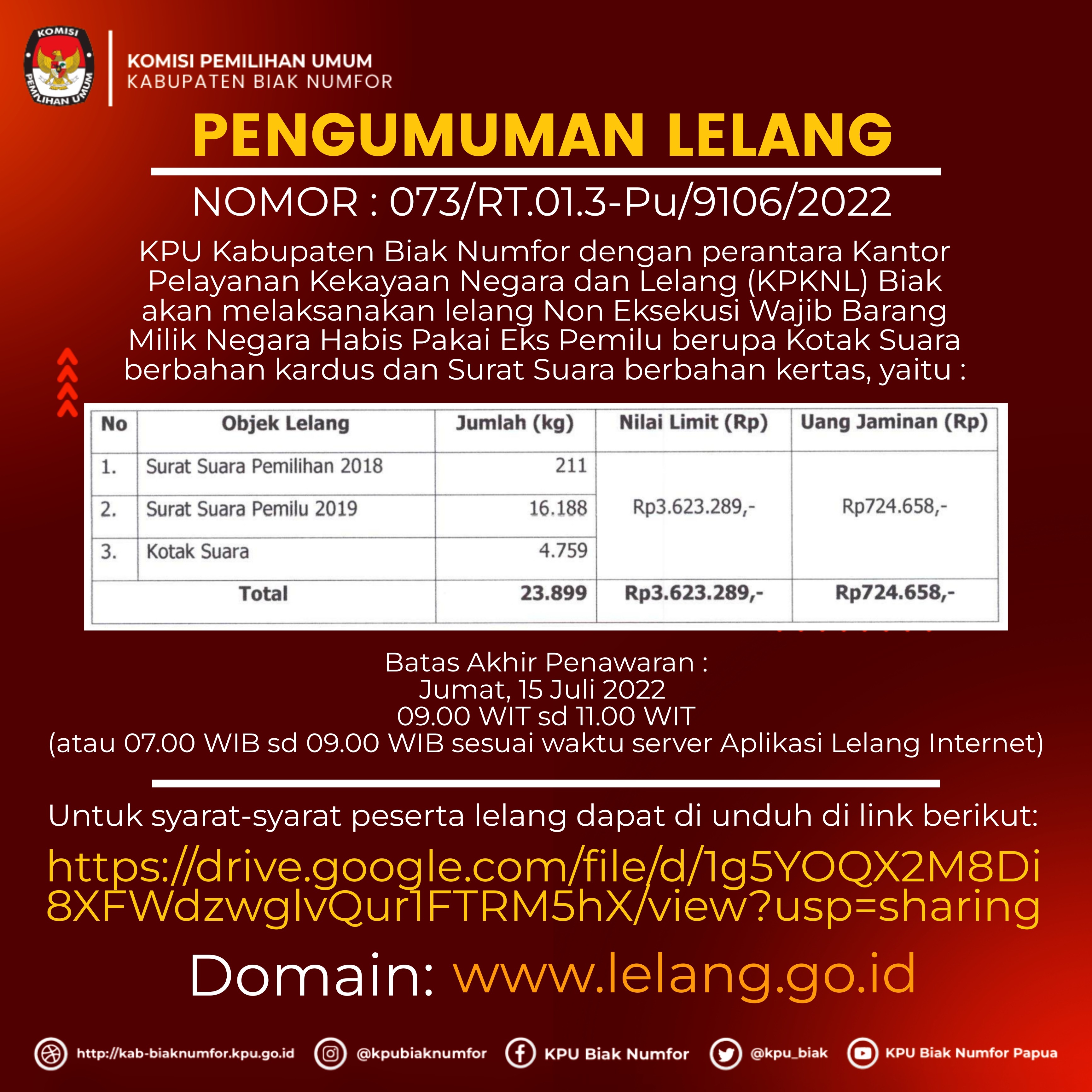 #TemanPemilih, Dalam rangka pelaksanaan Lelang BMN untuk menindaklanjuti Surat KPU RI Nomor 1268/RT.01.3-SD/2022 tanggal 17 Juni 2022 tentang persetujuan Penjualan Barang Milik Negara Pasca Pemilu/ Pemilihan Tahun 2020 serta Barang Perlengkapan Pemungutan Suara pada Komisi Pemilihan Umum Kabupaten/Kota, maka KPU Kabupaten Biak Numfor melalui Kantor Pelayanan Kekayaan Negara dan Lelang Biak (KPKNL) pada hari Jumat (15/7/2022) telah melaksanakan Lelang Eks Logistik KPU berupa Surat Suara Pemilu 2018, Surat Suara Pemilu 2019 dan Kotak Suara Berbahan kardus yang dijual 1 paket. Pejabat Lelang dari Kantor Pelayanan Kekayaan Negara dan Lelang Biak, Adrian Noor Prayudha menyampaikan terima kasih atas dukungan KPU Kabupaten Biak Numfor untuk melakukan proses lelang yang diikuti 7 Peserta Lelang sehingga hasil Lelang akan ditindaklanjuti dengan pembuatan Risalah Lelang dan menunggu penyetoran dana ke Rekening Kas Umum negara. Sementara itu Sekretaris KPU Kabupaten Biak Numfor, Agus Filma yang mengikuti proses lelang menyampaikan dalam proses lelang ini peserta lelang telah telah diarahkan pula untuk membuat pernyataan bersedia menghancurkan Surat Suara dengan cara dilebur atau didaur ulang sebagai salah satu syarat kewajiban peserta lelang bahkan proses pengangkutan dirinci agar dalam pelaksanaannya bisa sesuai dengan ketentuan. Sementara itu Pejabat Penjual/Lelang BMN KPU Kabupaten Biak Numfor, Aivi Nur Fahrizka menjelaskan hasil pelaksanaan lelang ini akan ditindaklanjuti sesuai ketentuan dengan menyerahkan Berita Acara Serah Terima dan Risalah lelang dan bukti setor ke rekening Kas Umum negara ke Sekjen selaku Pengguna Barang yang waktunya paling lambat 1 bulan untuk menjadi dasar dalam Keputusan Penghapusan BMN. Adapun Dokumentasi Kegiatan :