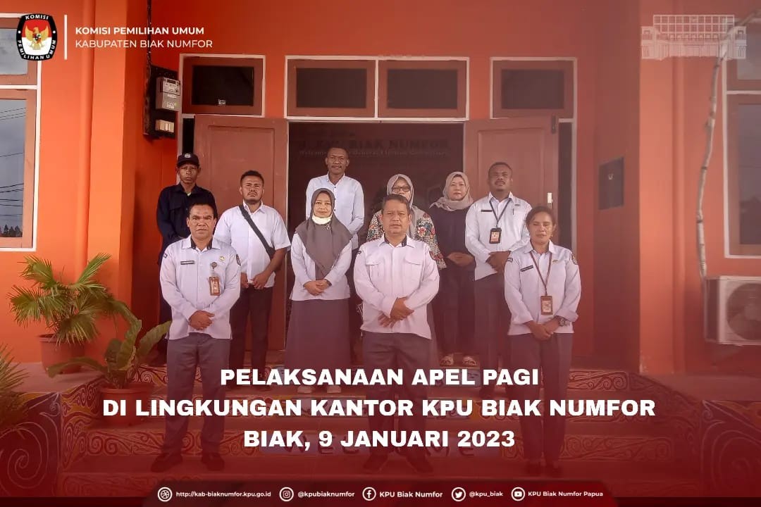 Apel dipimpin oleh Sekretaris KPU Kabupaten Bliak Numfor. Dalam kesempatan tersebut Agus Filma menekankan kepada seluruh staf untuk senantiasa menjaga kesehatan dan memaksimalkan proses Tahapan Pemilihan Umum Tahun 2024 yang sedang berlangsung.
